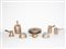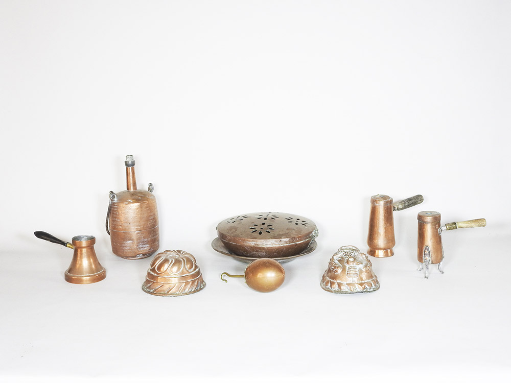 Lotto di oggetti in rame XIX secolo tra cui due stampi da budino, uno sbalzato con aquila (9)