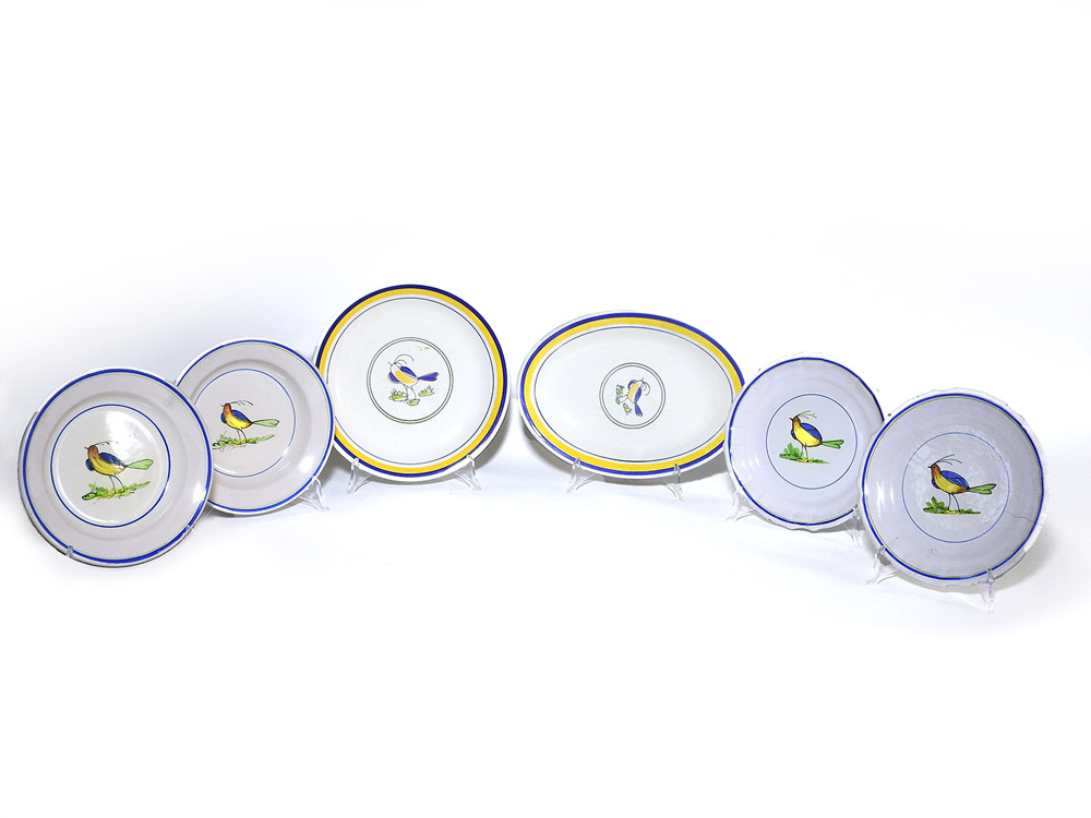 Serie di piatti in terracotta smaltata Manifattura Deruta dipinti con uccellini, diverse epoche, difetti (39)