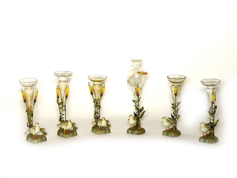 Serie di sei vasetti segnaposto in metallo inizio del XX secolo di gusto liberty, le basi realizzate come uccellini che sorreggono dei vasetti in vetro soffiato, difetti