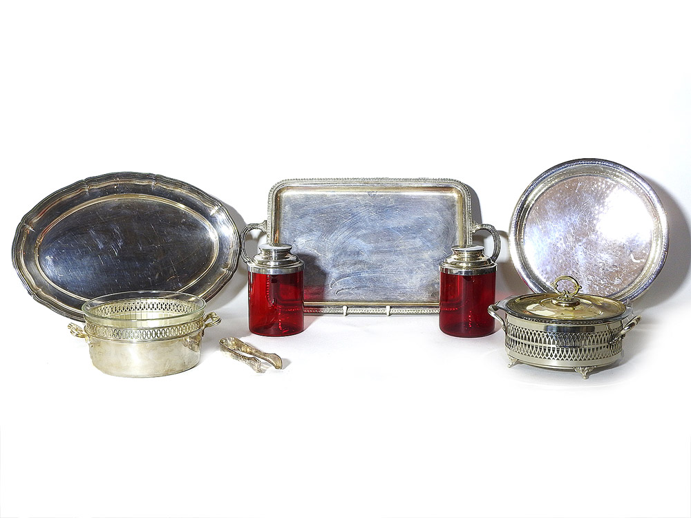 Lotto di oggetti in sheffield tre vassoi, due legumiere rotonde ed una coppia...