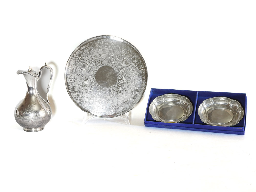 Lotto di oggetti in metallo argentato vassoio rotondo, caraffa e coppia di vaschette ovali (4)