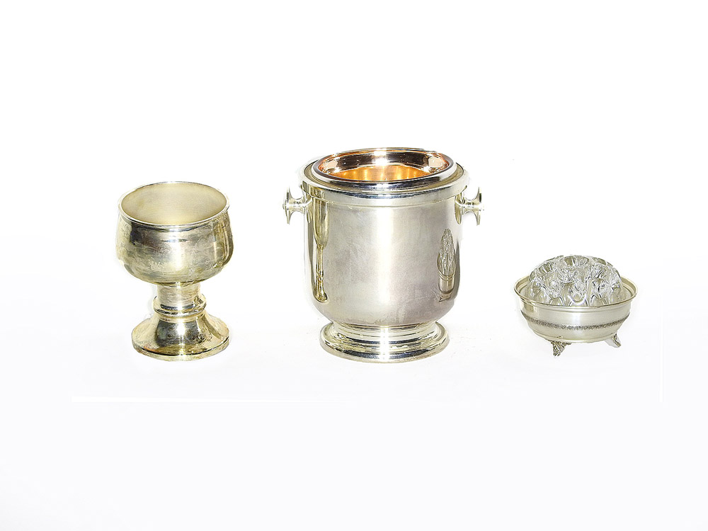 Lotto di oggetti in metallo argentato un rinfrescatoio, una coppa ed un portafiori (3)