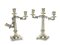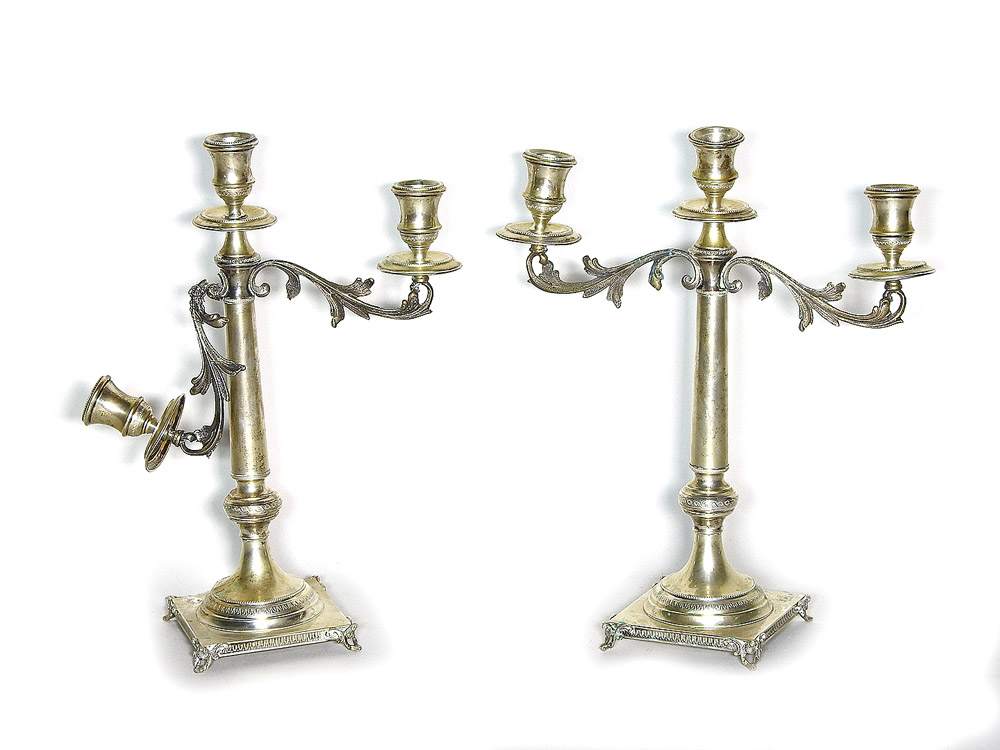 Coppia di candelabri in argento tre bracci portacandele, base appesantita, uno con difetti
