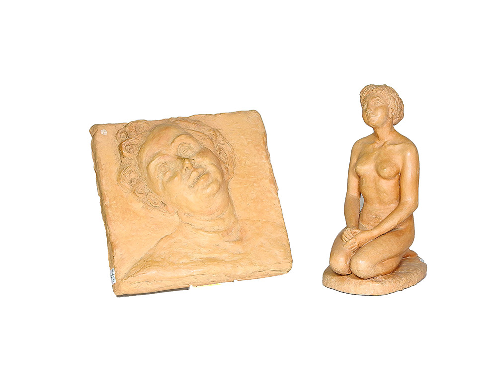Giuliana Anzilotti Gambarini (1930-2015) Scultura in terracotta raffigurante nudo femminile inginocchiato ed una placca a bassorilievo con volto di putto, uno firmato e datato Giuliana Del Carretto 1998 h cm 30, cm 26x27 (2)