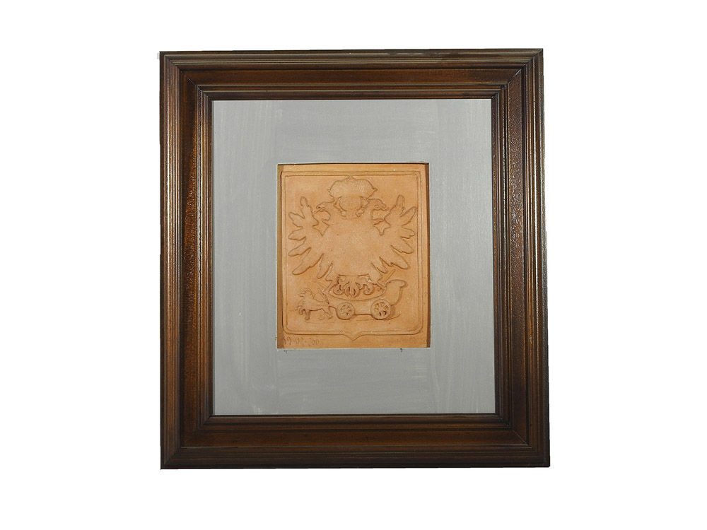 Stemma della famiglia Del Carretto di Ponti e Sessame realizzato a bassorilievo in terracotta, firmato e datato Galletti 19.02.2003, in cornice cm 28,5x23,5
