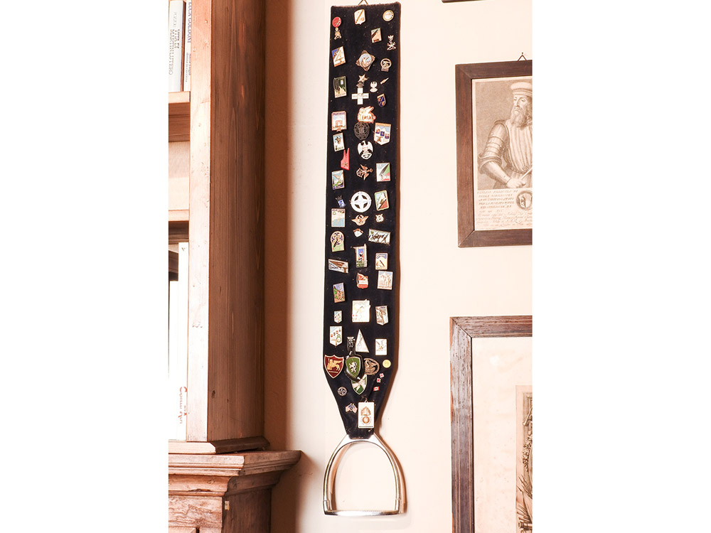Raccolta di distintivi militari applicati su di un sostegno in velluto a forma di staffa