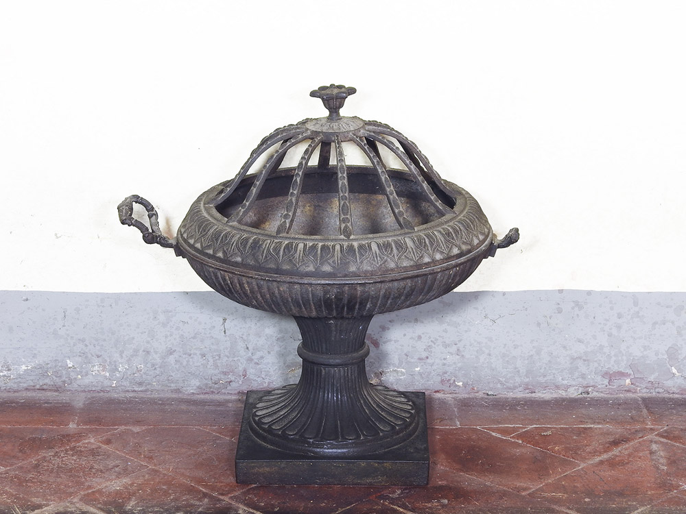 Braciere in ghisa XIX secolo realizzato come una grande coppa di gusto neoclassico con coperchio traforato, bordura a palmette, su piede a plinto h cm 56