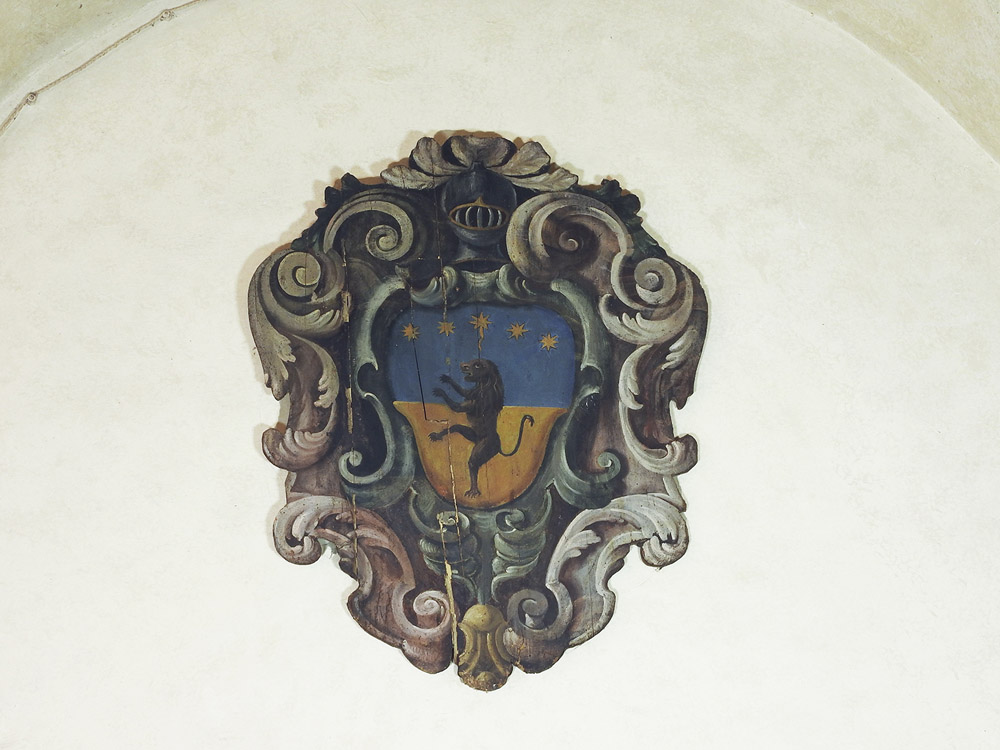 Stemma gentilizio XIX secolo dipinto ad olio su tavola sagomata, difetti cm 101x75