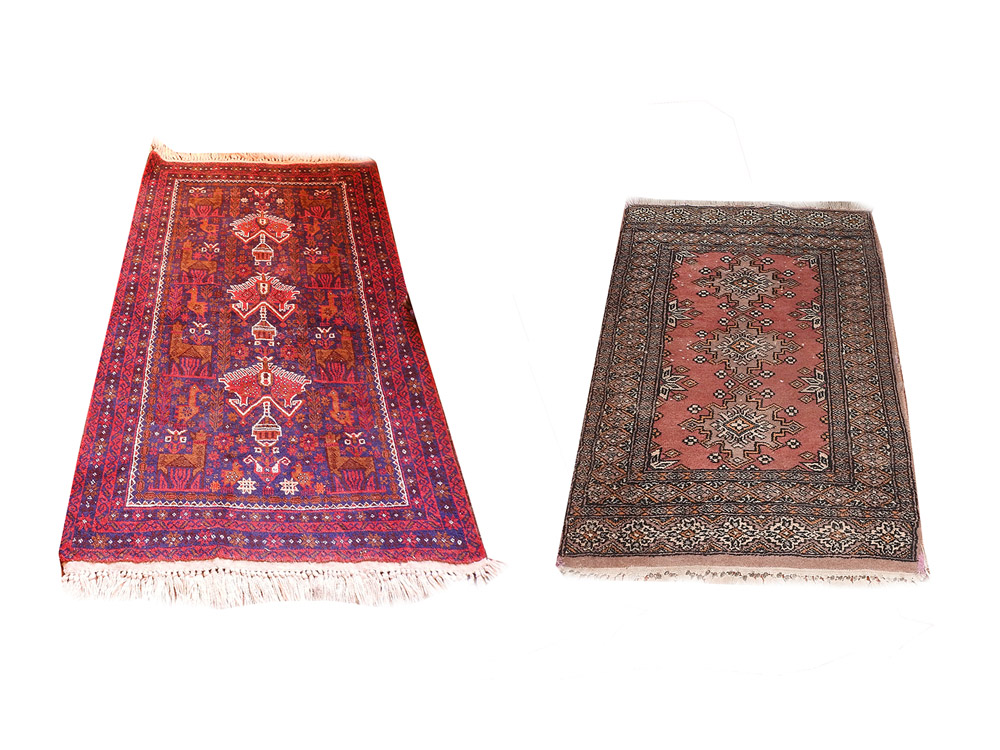 Due tappeti caucasici uno fondo rosso mattone ed uno fondo rosa antico, difetti cm 270x157, cm 92x63