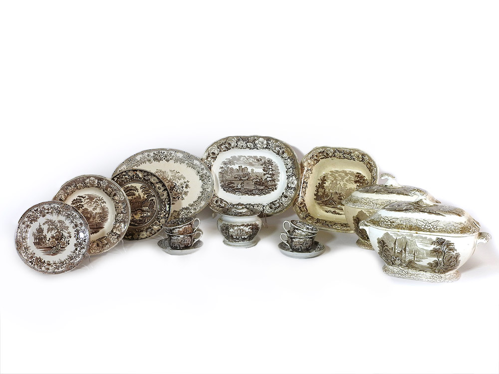 Servito di piatti in terraglia G.F. Cecchi, Florence - London, inizio del XX secolo decorato in monocromia marrone con paesaggi e motivi floreali, composto da 21 piatti piani, 24 fondi, 18 piattini, coppia di zuppiere, insalatiera, due vassoi, 10 tazze con piattini e zuccheriera, difetti e integrazioni (79)