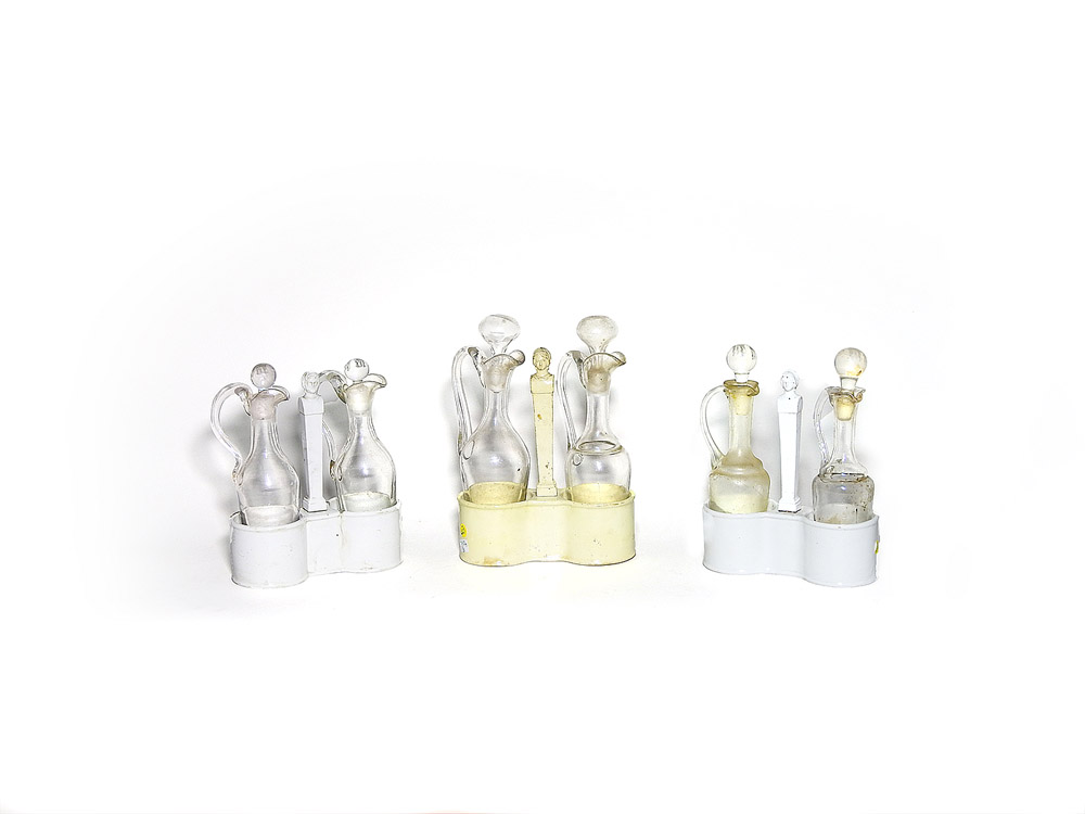 Coppia di oliere in porcellana inizio del XIX secolo di gusto neoclassico, presa centrale realizzata come un busto maschile e femminile ed un’altra simile in terraglia, corredate da ampolle coeve, difetti (3)