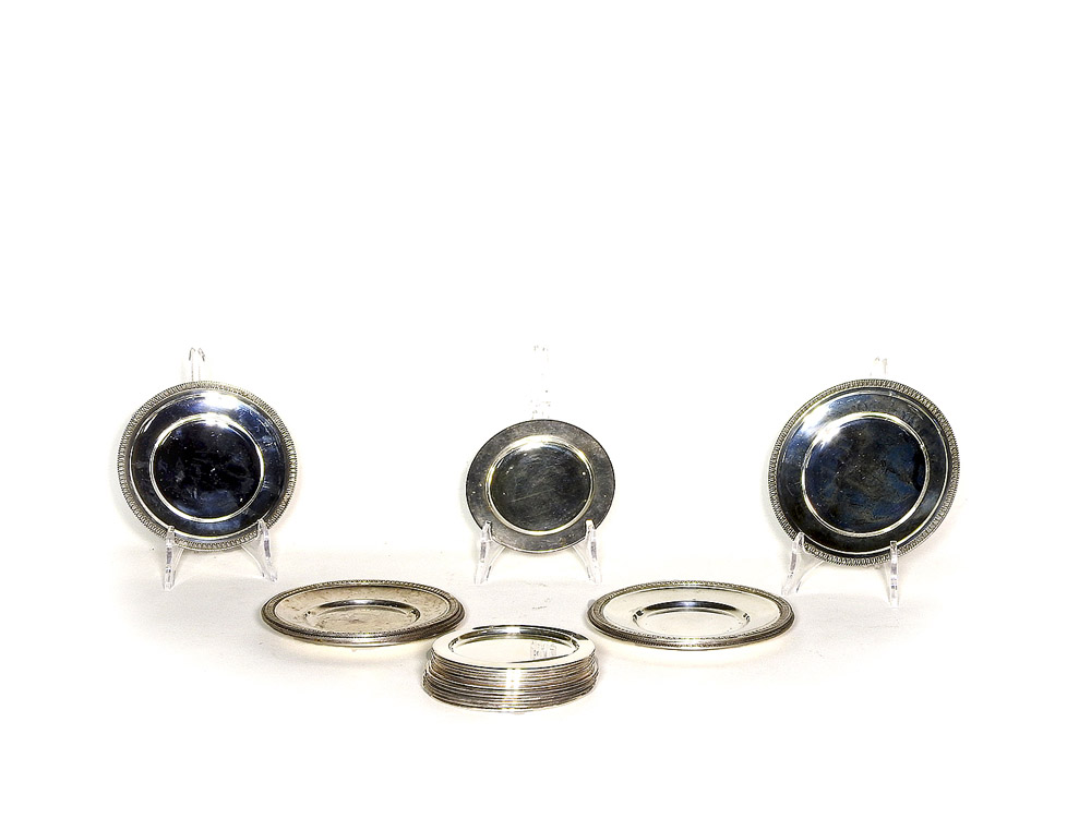 Lotto di argenteria composto da serie di nove sottobicchieri con bordo a palmette ed altri quattordici con bordo liscio gr 2100 (23)