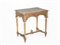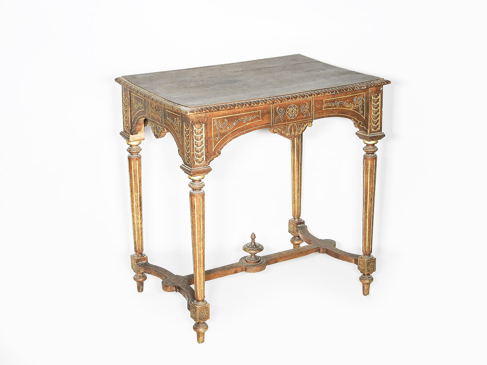 Tavolino in noce inizio del XX secolo pendaglina incisa con volute e girali lumeggiate in oro, gambe a cono scanalato riunite da traversa con finale a pinnacolo h cm 73x70x48