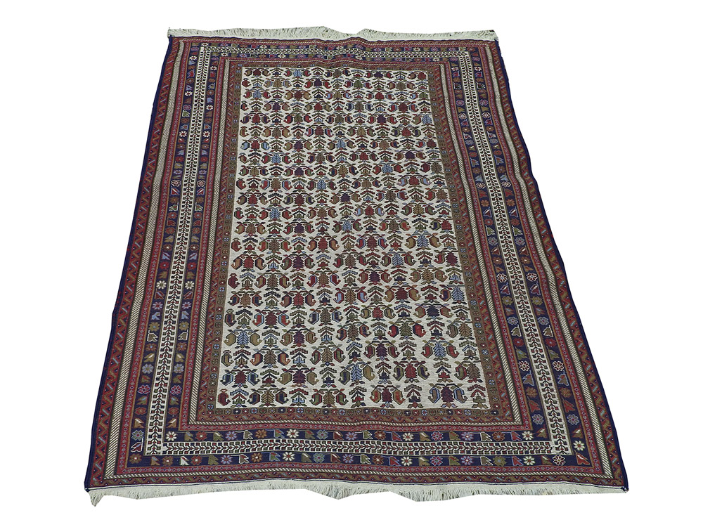 Tappeto persiano fondo beige, campo con motivi floreali e vegetali stilizzati nei toni del blu, rosso e verde cm 197x133