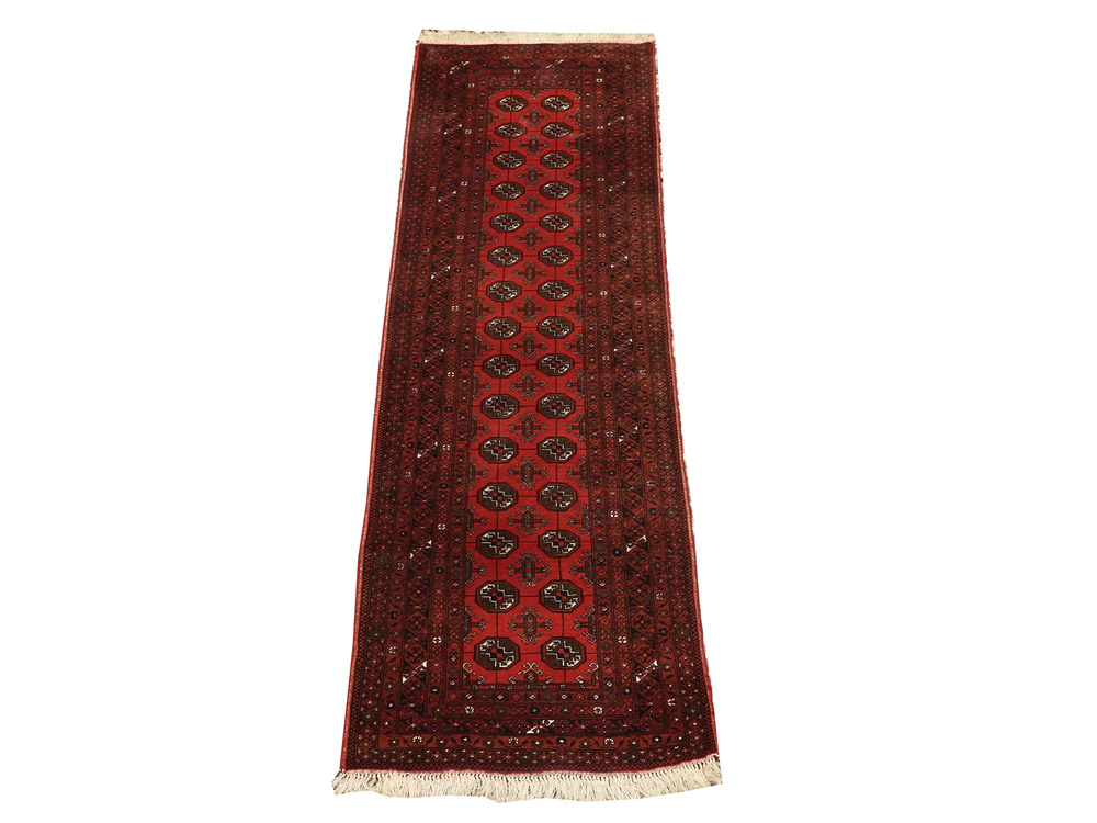 Tappeto galleria Bukara fondo rosso, campo con motivi geometrici nei toni dell'avorio, marrone e nero cm 292x84