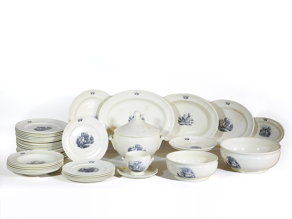 Servito di piatti da cacciagione in porcellana Richard Ginori, San Cristoforo Milano, 1935 decorato in monocromia nera con scene di caccia e corona gentilizia, completo per sei persone, composto da 20 piatti piani, 6 fondi, 6 da frutta, 4 vassoi, zuppiera, una alzata, due insalatiere, una salsiera e una raviera, alcuni difetti (42) Recano marchio grafico ed iscrizione A.N.B.R.V.I. 1935