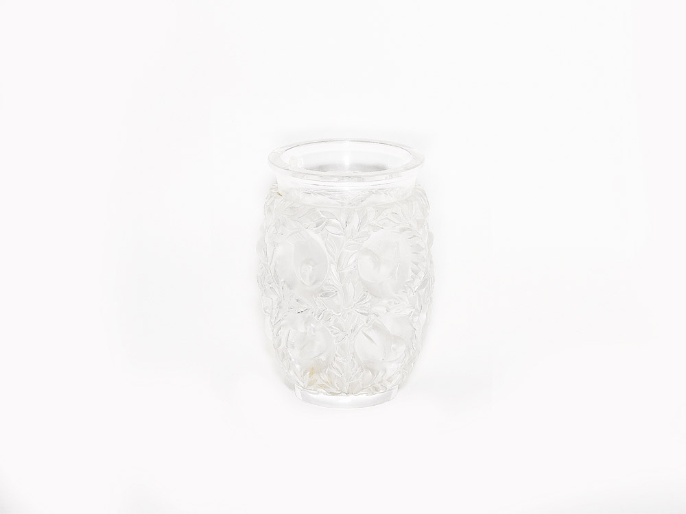 Vaso in vetro incolore e satinato Bagatelle Francia, Lalique corpo molato con motivo di uccellini e racemi h cm 17 Reca firma incisa Lalique France