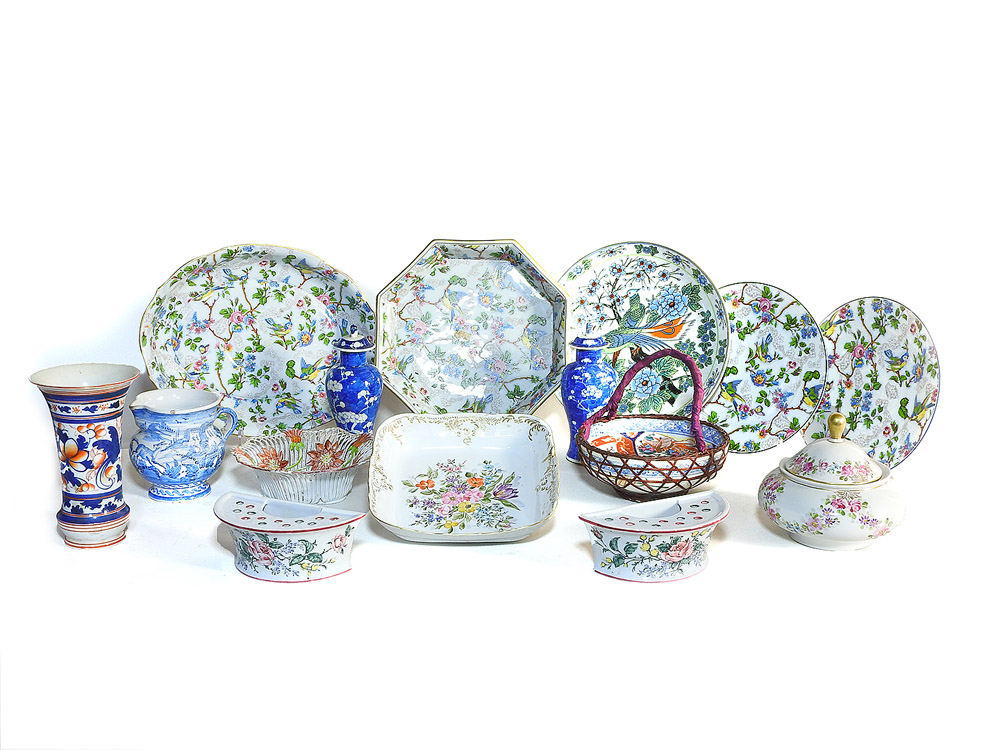 Lotto di porcellane tra cui alcune orientali ed una piccola brocca in maiolica, Genova XIX secolo