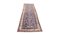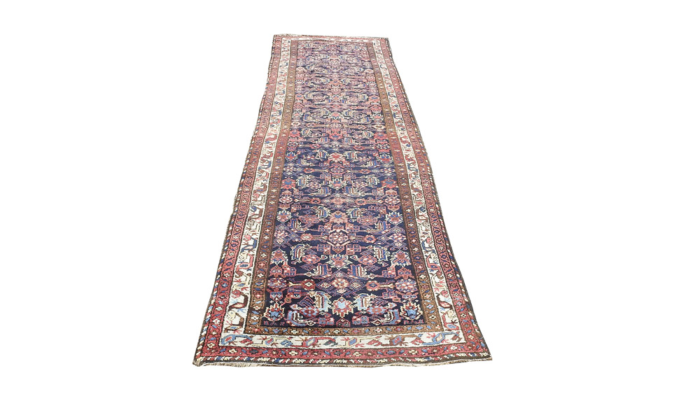 Tappeto galleria caucasico caucasico fondo blu notte, campo con disegni geometrici nei toni del rosso, giallo e avorio, lievi difetti cm 392x107,5