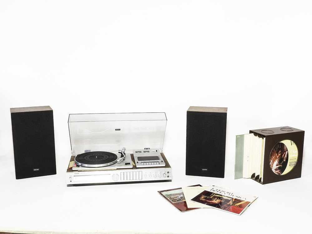 Impianto stereo corredato da mobiletto e collezione di dischi a 33 giri, danni e difetti