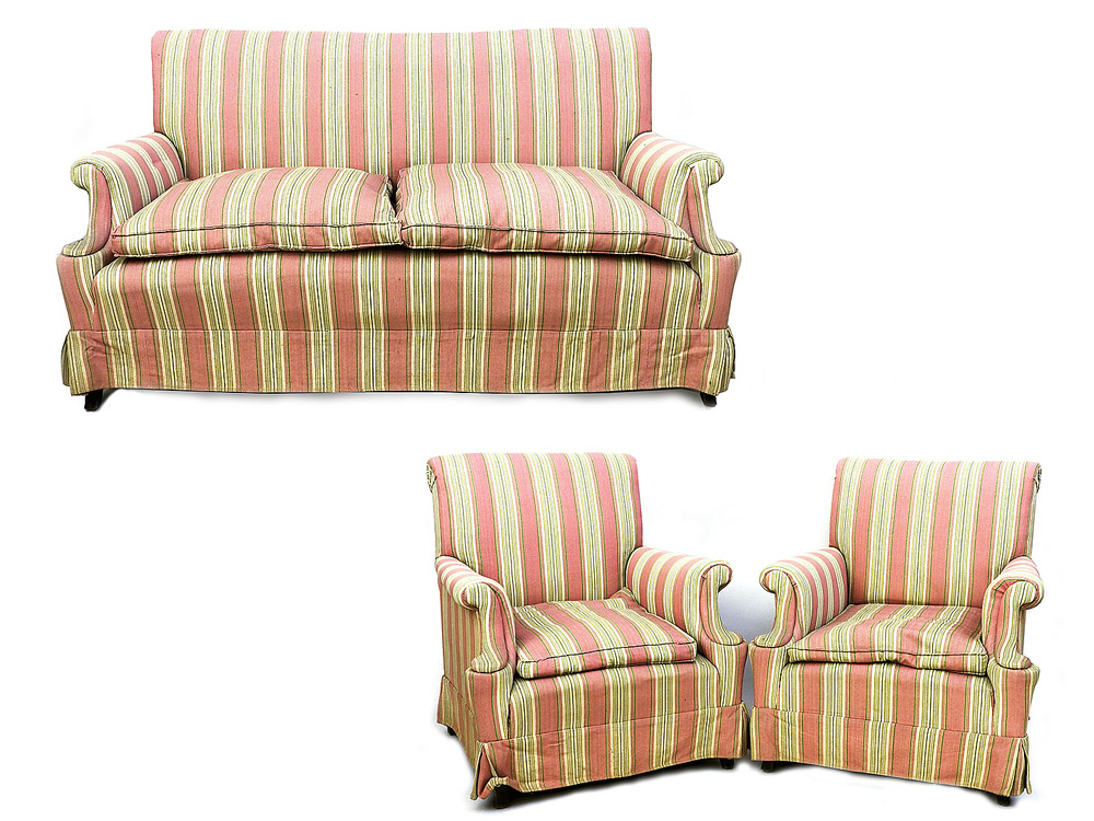 Lot 421 | Divano imbottito rivestito in tessuto a righe nei toni del rosa e del verde,...