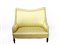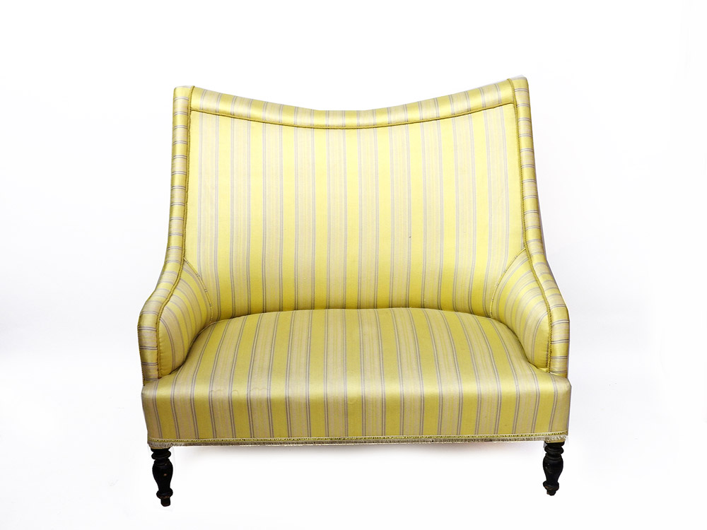 Divanetto a due posti in legno ebanizzato schienale sagomato, imbottito e rivestito in tessuto a righe nei toni del giallo lungh cm 120