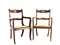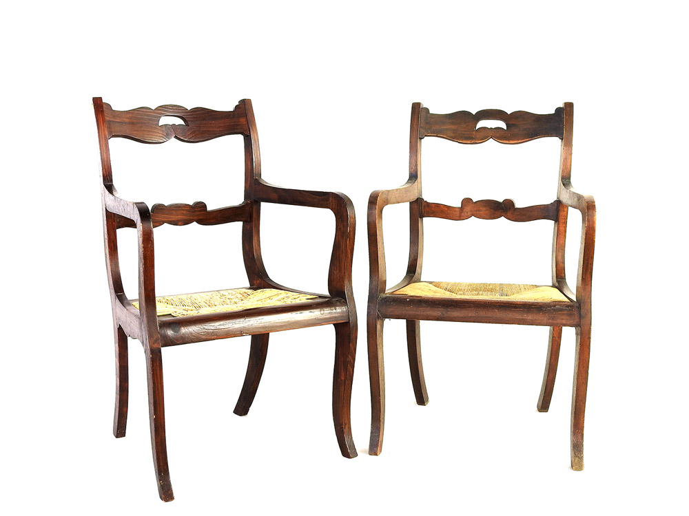 Serie di quattro poltroncine in noce XIX secolo schienale con cartella sagomata e traforata, braccioli a giorno, gambe mosse, seduta impagliata