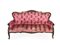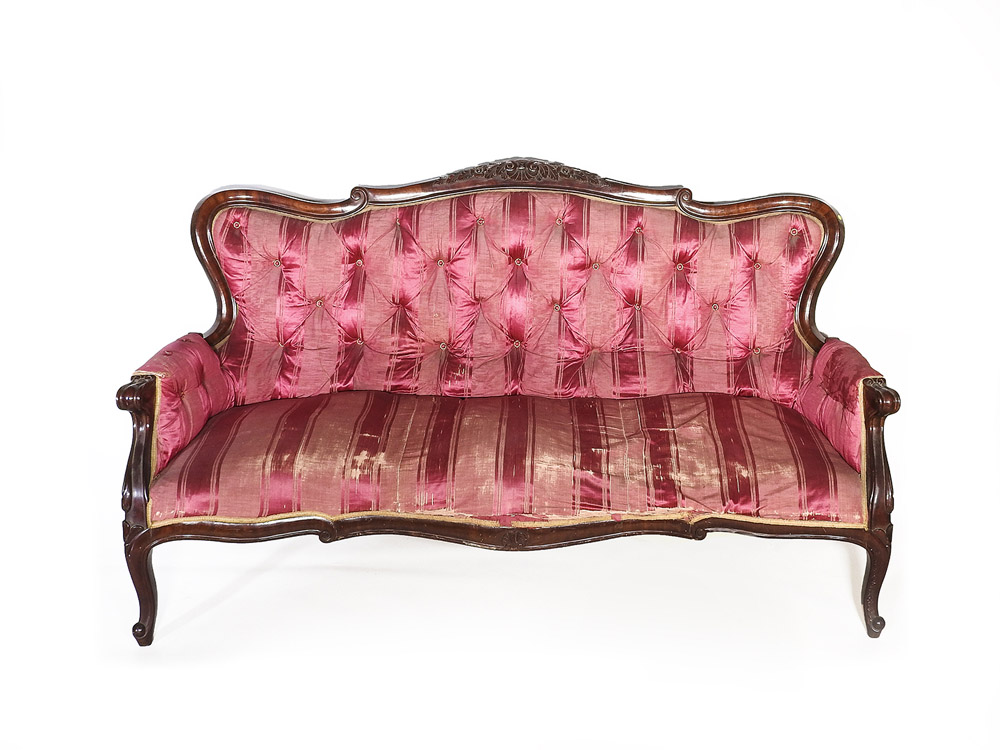 Divano in mogano metà del XIX secolo schienale sagomato intagliato con motivi floreali, braccioli a ricciolo, gambe mosse, imbottito e rivestito in seta matelassé carminio, lievi difetti lungh cm 188