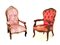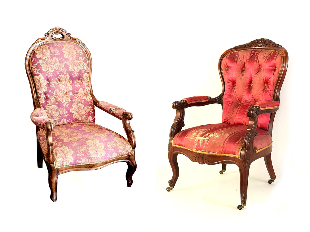 Due poltrone in noce e mogano metà del XIX secolo cimase intagliate, braccioli desinenti a ricciolo, gambe mosse, imbottite e rivestite, difetti