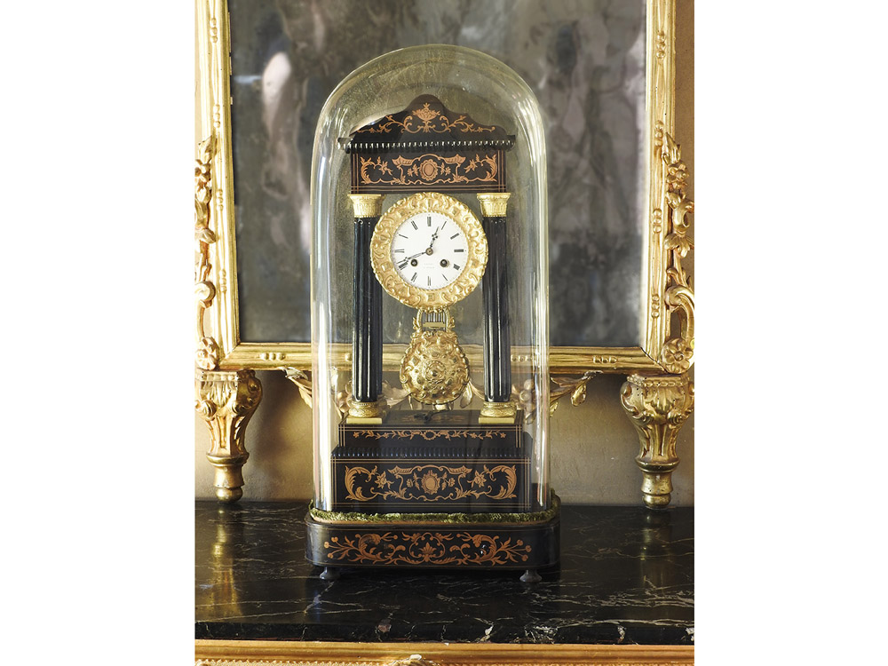 Orologio da tavolo a tempietto in mogano Leroy a Paris, prima metà del XIX secolo interamente intarsiato in legni di frutto, quadrante in smalto con numeri romani tra colonne in legno ebanizzato, dettagli in metallo dorato, entro campana in vetro soffiato originale, lievi difetti h cm 61