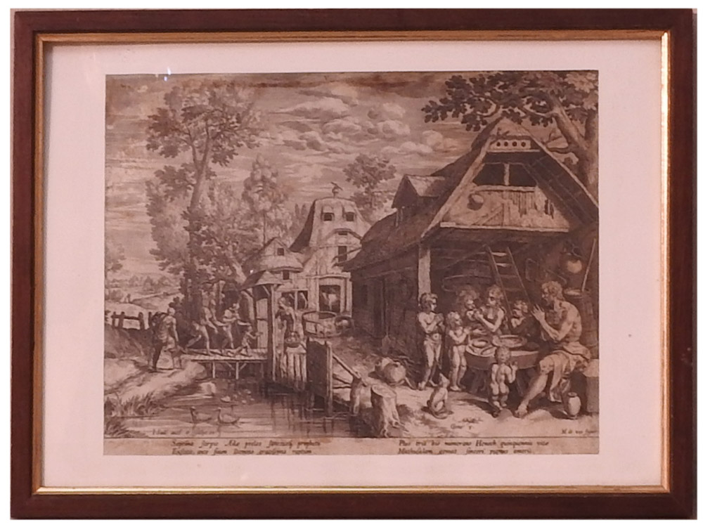 Jan Sadeler I (1550-1600) Enoch e la sua famiglia a tavola 1586 incisione, firmata in lastra, in cornice, difetti cm 19,5x26,5 Quinta tavola dalla serie “La storia della famiglia di Seth”