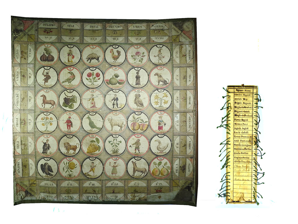 Gioco del Biribisso XVIII secolo composto da un pannello dipinto e stampato su carta applicata a tela e da una tavoletta segnapunti, difetti