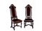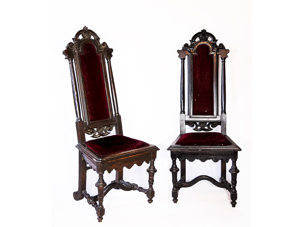 Coppia di seggioloni in noce XVII secolo schienale con cimasa architettonica centrata da conchiglia sorretta da due colonne, gambe anteriori tornite riunite da traversa sagomata, rivestiti in velluto rosso