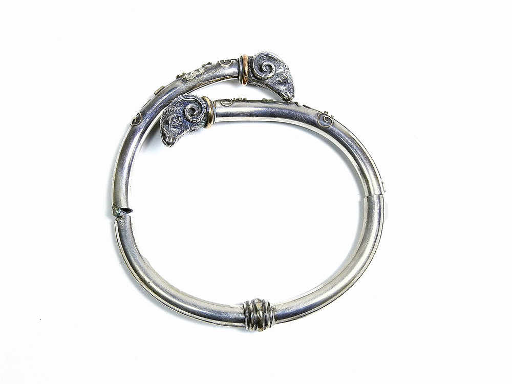 Bracciale d’epoca in argento realizzato come un cerchio con finali a testa di ariete, difetti gr 22,6