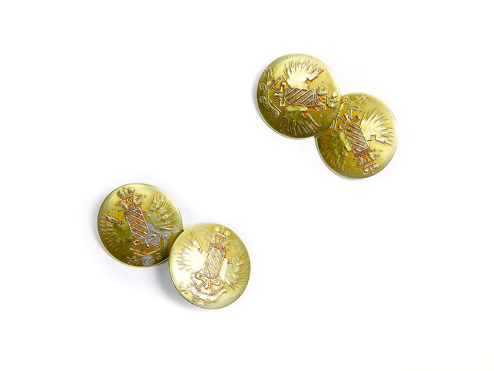 Paio di gemelli in oro giallo 18 kt cesellati con lo stemma della famiglia...