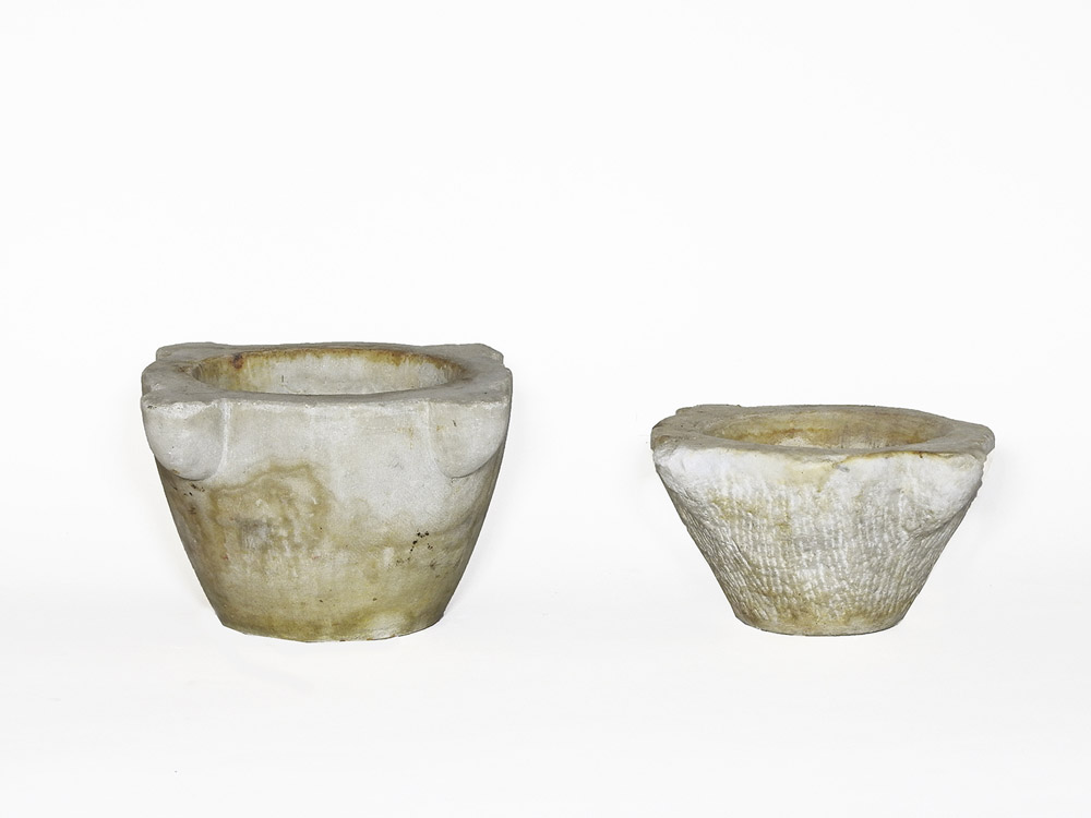 Due antichi mortai in marmo bianco alcuni difetti