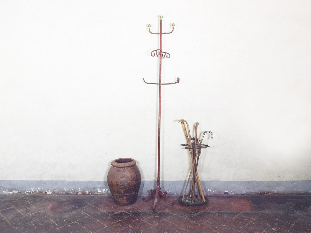 Lotto un attaccapanni in ferro battuto laccato rosso con finali in ottone, quattro piedi a ricciolo, un portabastoni in ghisa con alcuni bastoni da passeggio ed un piccolo orcio in terracotta, difetti (8)