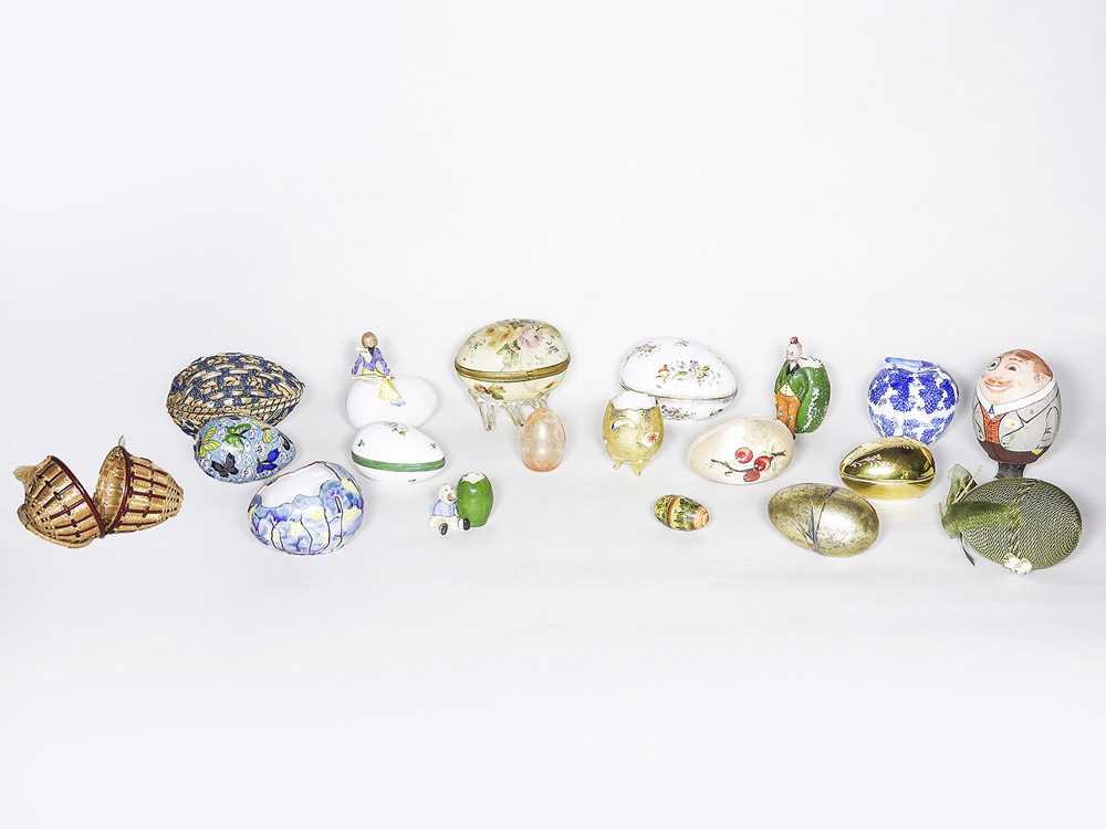 Lotto di curiosità tra cui alcune uova in ceramica policroma