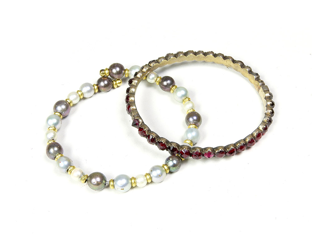 Due bracciali rigidi bijoux uno con perle ed uno d'epoca impreziosito da cristalli rossi