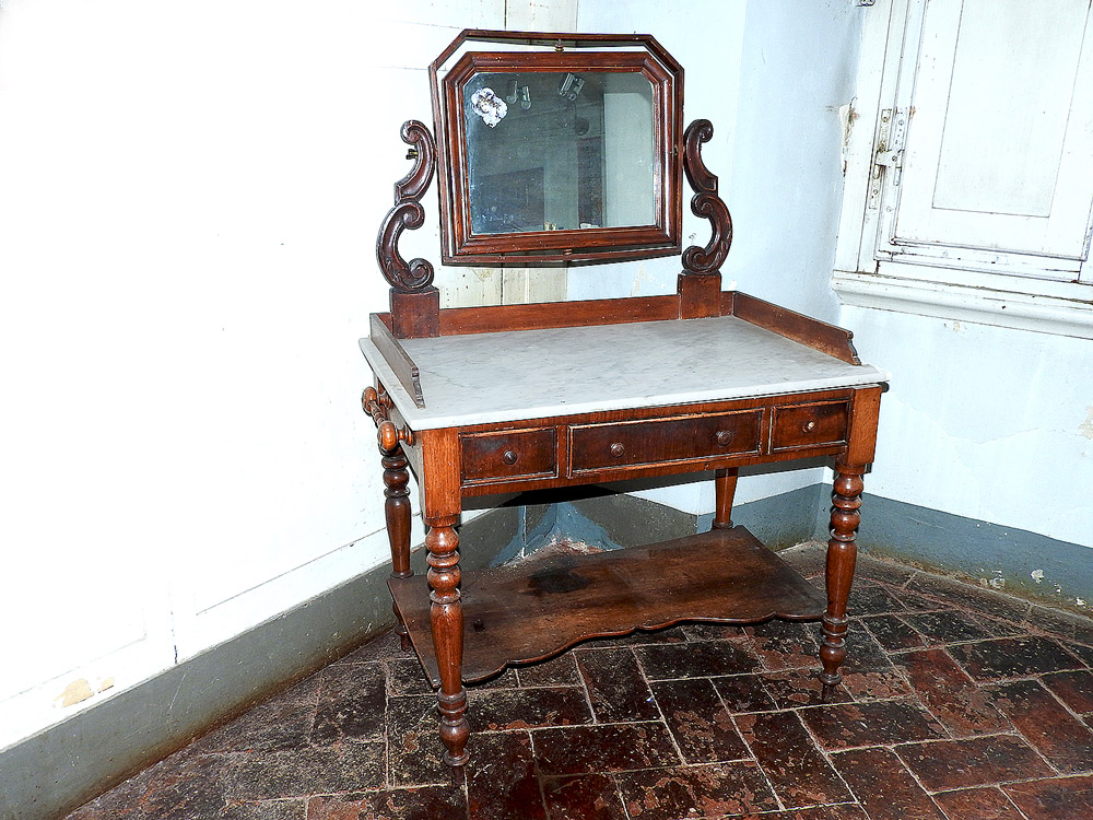 Toilette in noce fine del XIX secolo piano in marmo bianco, specchiera a...