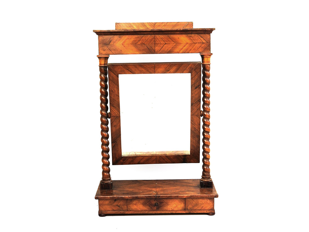 Psiche da tavolo impiallacciata in noce e piuma di noce metà del XIX secolo sostegni laterali tortili, un cassettino nella base, piedi a palla schiacciata h cm 92x59x30