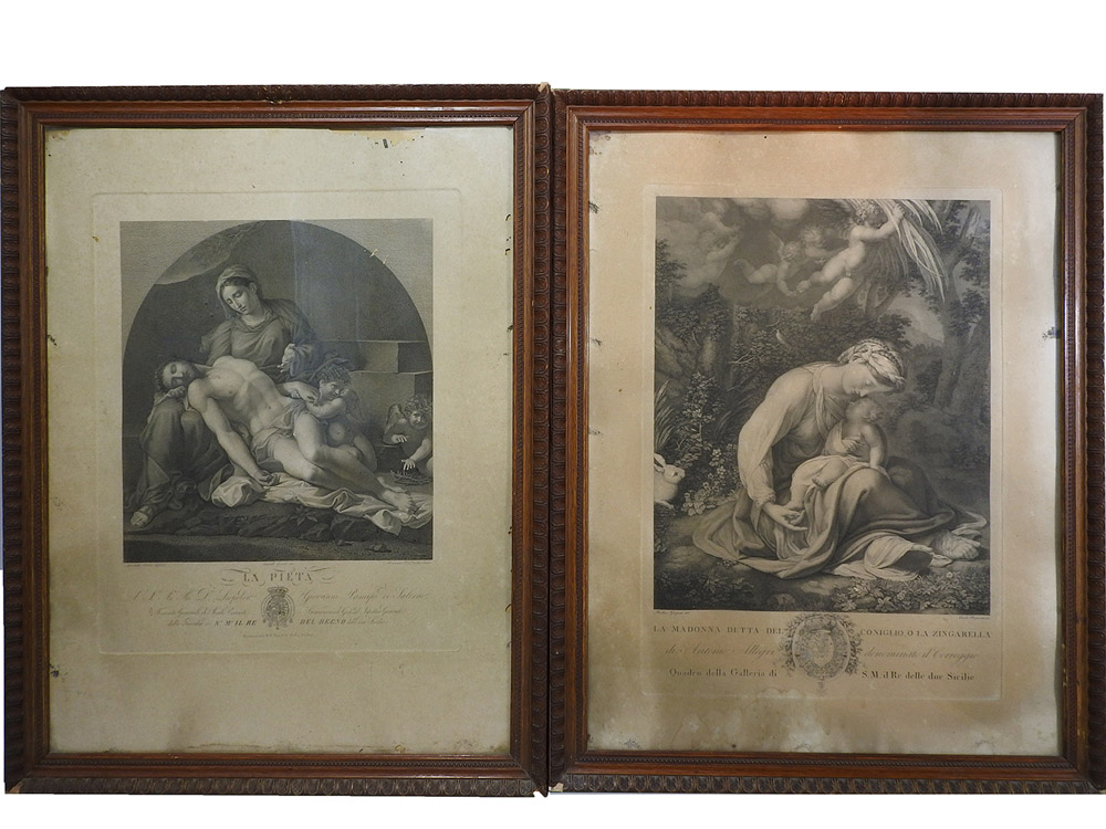 Due incisioni Carlo Porporati (1741-1816) Madonna con Bambino e Beniamino del Vecchio ( attivo nel XIX secolo) La Pietà in cornice, difetti cm 58x41, cm 52x41