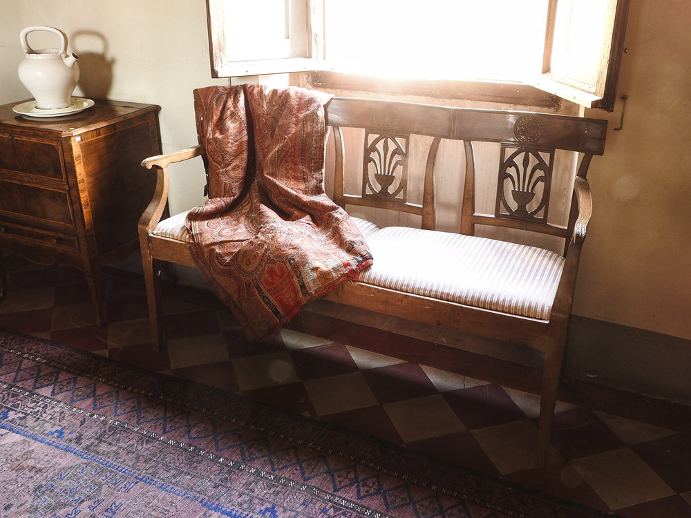 Divanetto a panca in noce inizio del XIX secolo schienale con tre cartelle a vaso intagliate e traforate, braccioli a ricciolo, gambe anteriori a faretra, seduta imbottita e rivestita in tessuto rigato nei toni del verde e del rosa lungh cm 136,5