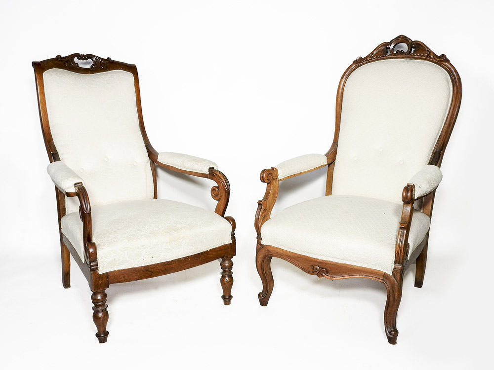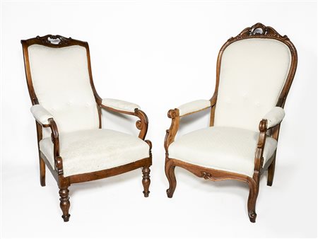 Due poltrone in noce metà del XIX secolo braccioli desinenti a ricciolo, una con gambe tornite ed una con gambe mosse, imbottite e rivestite in tessuto avorio