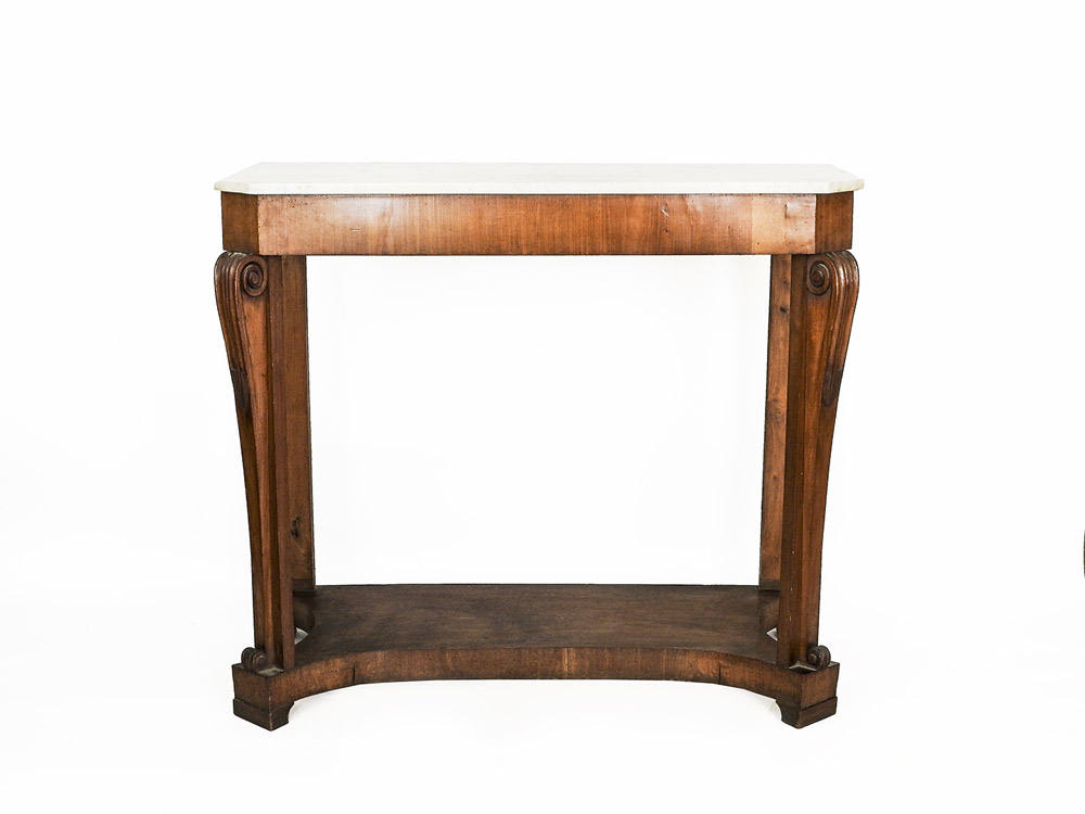Console impiallacciata in noce prima metà del XIX secolo piano in marmo bianco, lesene anteriori intagliate con motivo di foglie stilizzate riunite da ripiano alla base h cm 105,2x120,2x49,6