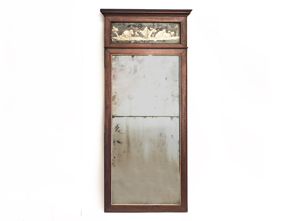 Caminiera in noce inizio del XIX secolo cimasa decorata da placca in vetro...