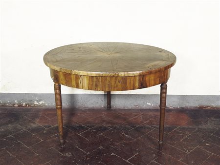 Tavolo rotondo impiallacciato in piuma di noce metà del XIX secolo piano intarsiato con motivo di rosone, un cassetto nella fascia, gambe tornite con piedini a vaso, difetti h cm 77,5, diam cm 113