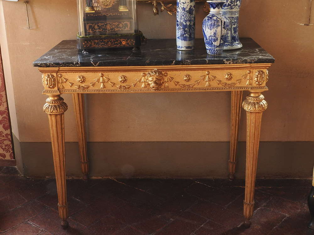 Console in legno intagliato e dorato fine del XVIII secolo fascia intagliata con testa di leone e festoni, gambe a cono scanalato, piedi a palla schiacciata, piano in marmo nero di epoca posteriore h cm 88x104,5x58