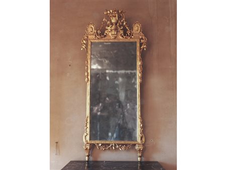 Specchiera in legno intagliato e dorato seconda metà del XVIII secolo cimasa riccamente intagliata con vaso, motivi floreali e tralci di foglie, due medaglioni ovali con profili maschili, piedi sagomati, difetti e alcune mancanze h cm 184x80