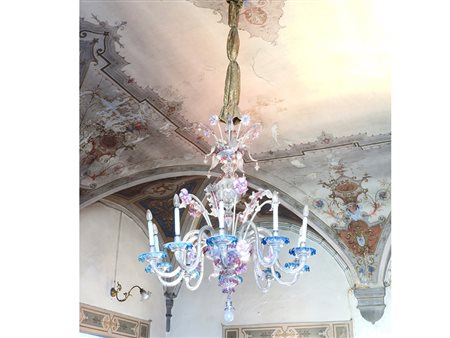 Grande lampadario in vetro soffiato Murano, inizio del XX secolo dieci bracci portacandele tra trionfo di fiori nei toni pastello h cm 140 circa, diam cm 105 circa